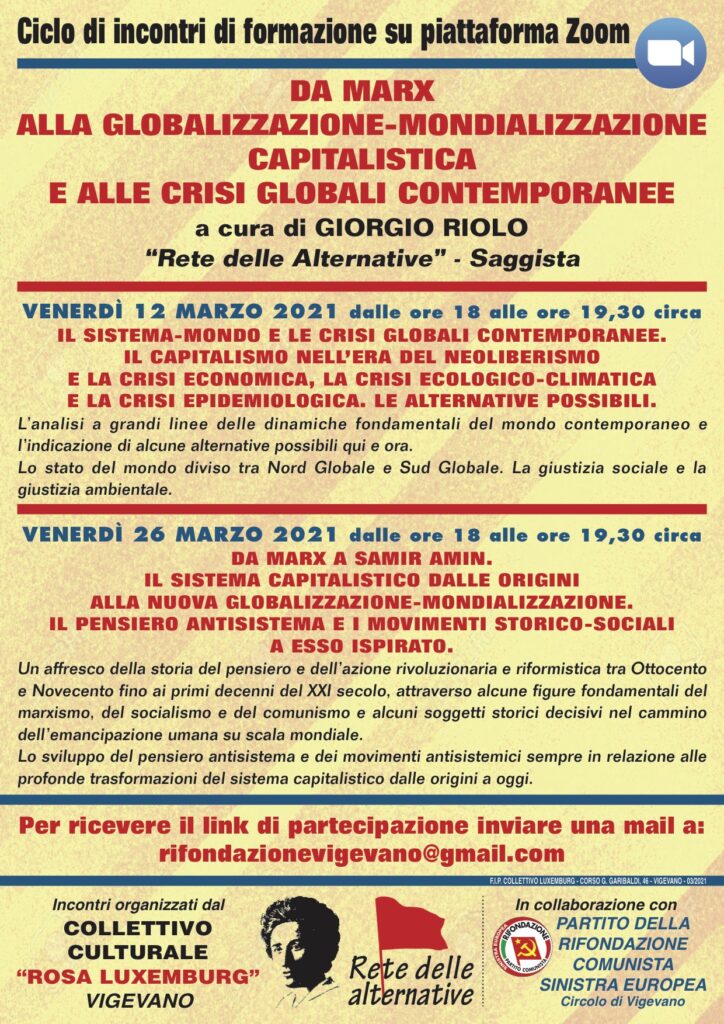 Dalle crisi globali contemporanee a Marx. Si può sintetizzare così il ciclo di incontri di formazione sulla piattaforma Zoom organizzati dal Collettivo culturale “Rosa Luxemburg” di Vigevano in collaborazione con il Circolo “Hugo Chavez Frias” del Partito della Rifondazione Comunista di Vigevano. Si tratta di due appuntamenti gratuiti in diretta curati dal saggista Giorgio Riolo, della “Rete delle Alternative”, in programma venerdì 12 marzo e venerdì 26 marzo sempre dalle ore 18 alle ore 19,30 circa.