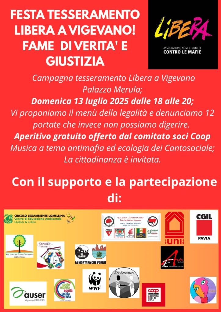 Dodici portate che non possono essere digerite da chi sostiene il valore della legalità contro la mafia e la corruzione. È un menu che lascia a stomaco vuoto quello denunciato nella campagna nazionale di Libera dal titolo “Fame di Verità e Giustizia”, a cui il tessuto associativo lomellino intende abbinare un contraltare di tutt’altro sapore nel corso dell’evento organizzato per domenica 13 luglio a partire dalle 18 a palazzo Merula a Vigevano.