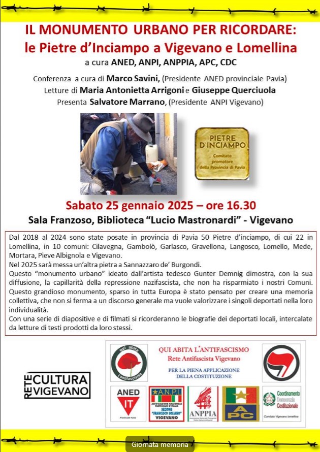 14 Gennaio 2025 / In Anpi, Comunicati stampa, I racconti, News, Resistenza, Uncategorized / Tags: #giuseppequerciola, #marcosavini, #mariantoniettaarrigoni, #pietred'inciampo, Anpi, àsalvatoremarrano / By Rino / Commenti disabilitati su Il monumento urbano per ricordare: le Pietre d’Inciampo a Vigevano e Lomellina