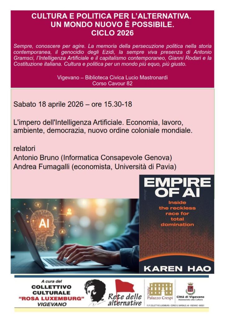 vi invio la presentazione del quarto incontro del nuovo ciclo 2026 organizzato dal Collettivo Culturale Rosa Luxemburg – Rete delle Alternative. Vi allego il volantino del 18 aprile. Saluti fraterni. Vladimiro