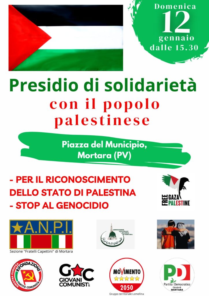 Domenica 12 gennaio alle ore 15:30 in piazza del Municipio a Mortara terremo un presidio di solidarietà con il popolo palestinese. Le parole d’ordine sono le stesse della manifestazione di dicembre 2023, a testimonianza che nulla purtroppo è cambiato. Vi aspettiamo numerosi!