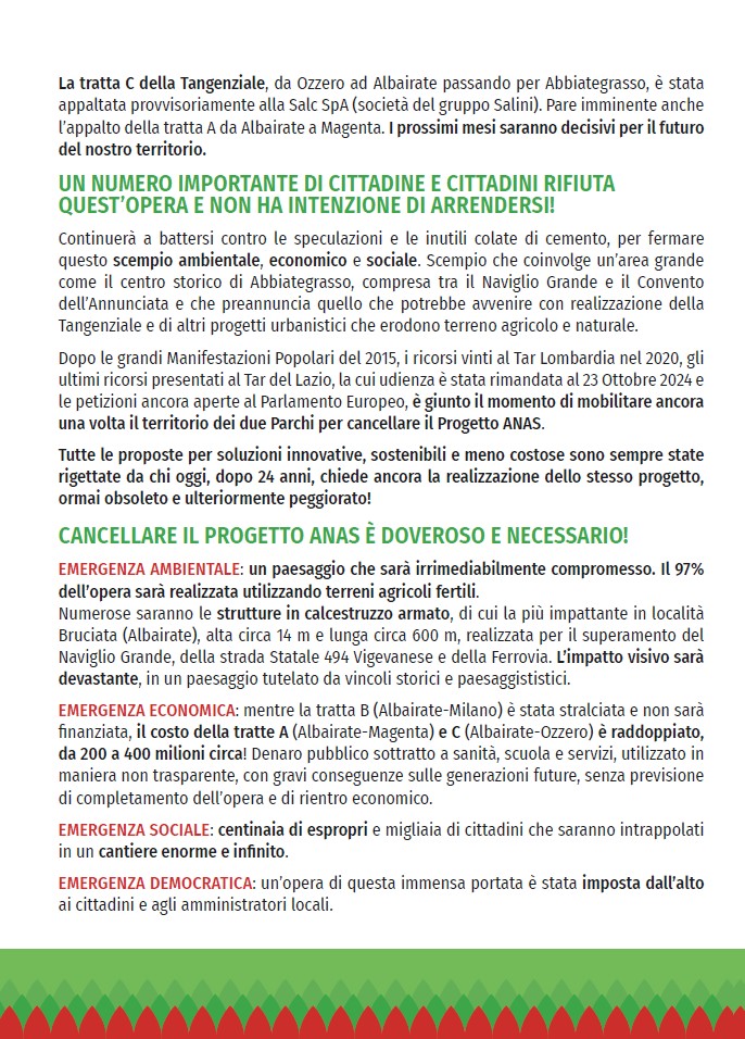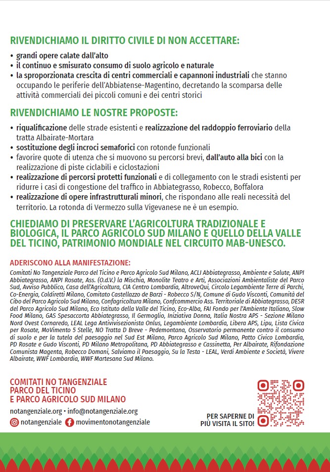 Esprimiamo anche la nostra totale contrarietà al progetto, proponendo come alternativa una circonvallazione a basso impatto ambientale, che parta da La Soria e che arrivi fino al Ponte sul Naviglio grande di Abbiategrasso.