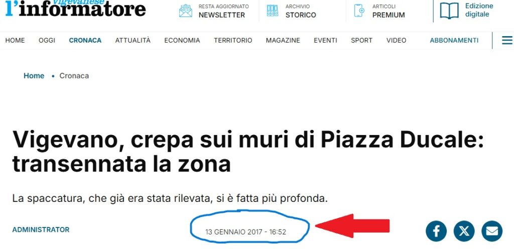 In tutto questo il sindaco Ceffa ha dichiarato che “Toccherà al proprietario dell’immobile coinvolto assumersi la responsabilità”. Quello che il signor sindaco ignora è che sono anni che i cittadini mandano segnalazioni di questo genere. Abbiamo condotto una veloce ricerca: in un articolo dell’Informatore Vigevanese del 2017 si parlava già dello stato di pericolo e incuria in cui versavano le strutture portanti della Piazza Ducale.